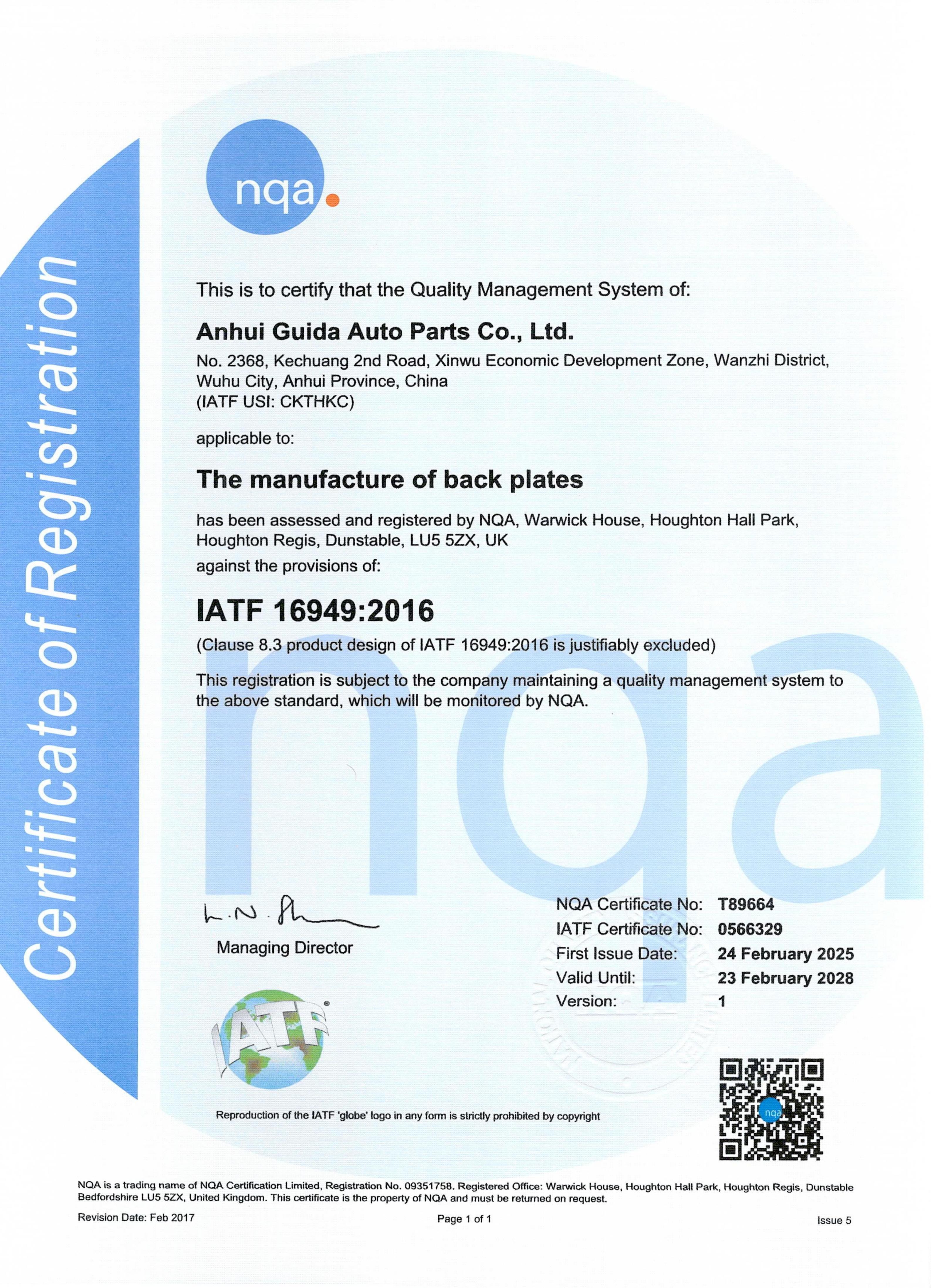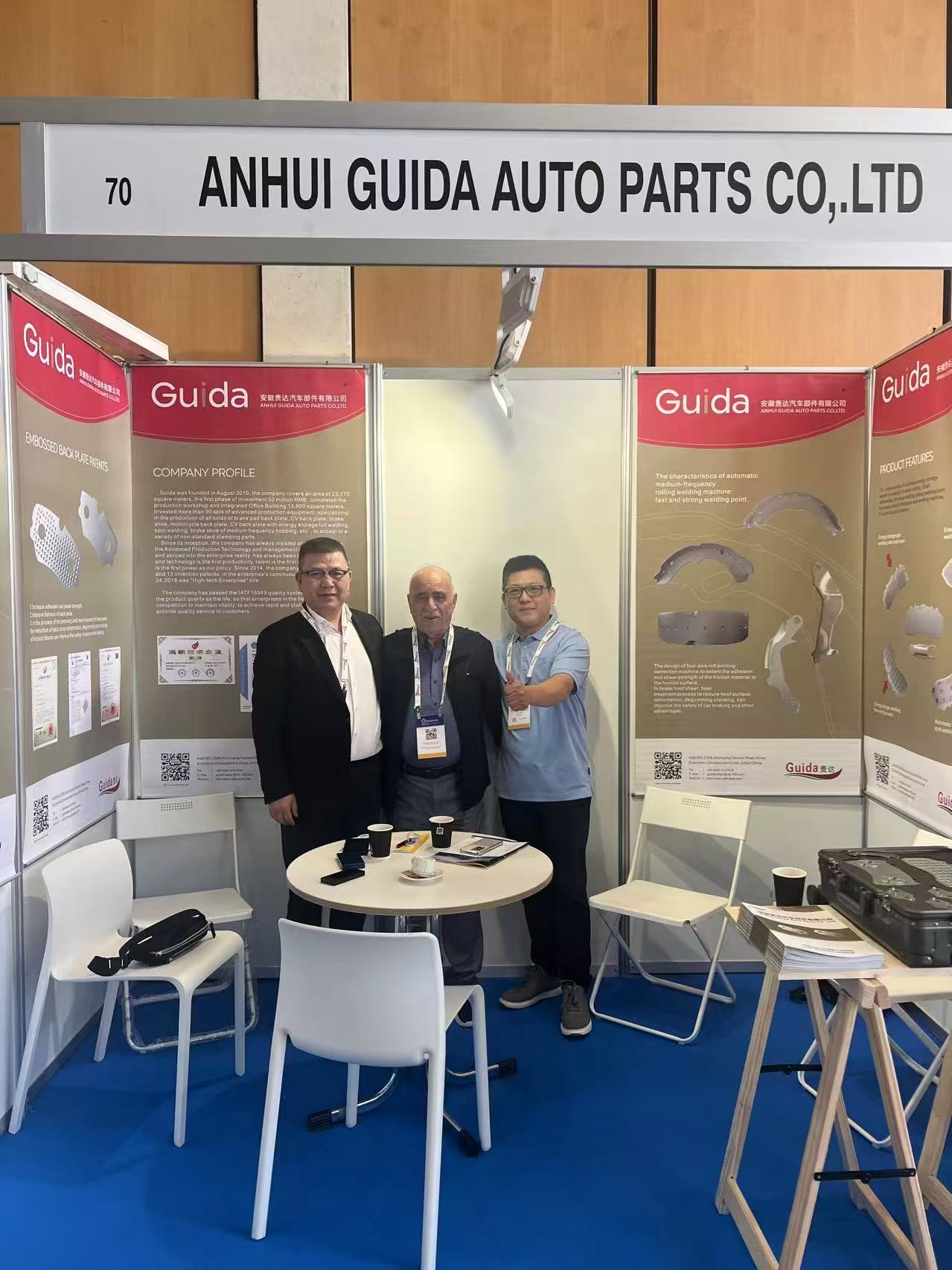 Anhui Guida Automotive Parts Co., Ltd. was established in August 2010 and is located in the "National Automotive Parts Export Processing Base" - Anhui Xinwu Economic Development Zone. It focuses on the production, sales, and mold processing of brake pad steel backs and shoes, covering an area of 23773 square meters. The first phase has built a production workshop of 9200 square meters and a comprehensive office building of 4500 square meters, with a total investment of 50 million yuan. The company has over 90 advanced production equipment of various types. Including 12 domestically advanced 100 ton to 315 ton pneumatic punching machines, 40 100 ton to 315 ton hydraulic presses, and independently developed automatic feeding machines, achieving semi-automatic production of equipment, bus spot welding and full welding machines, shoe semi-automatic rolling welding machines, product cleaning, grinding and rust prevention integrated machines, automatic drilling machines, automatic sanding and stabbing machines and other production equipment; The company also has 12 advanced medium wire cutting machines and an independent research and development team, achieving complete autonomy in mold development. Automated production equipment provides a good guarantee for product quality. At present, the company has 14 new patents and 21 invention patents, and was awarded the title of "High tech Enterprise" for the first time in 2018, and has continuously passed the evaluation. The company is committed to building and improving its quality system, and has obtained certifications for ISO9001 and ISO16949:2016 quality systems, strictly adhering to quality system management.